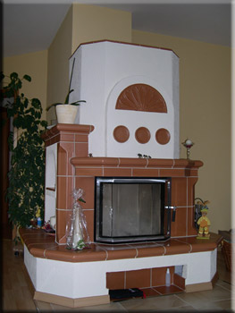 Warmluftkamin mit aufwendiger Kachelverkleidung,